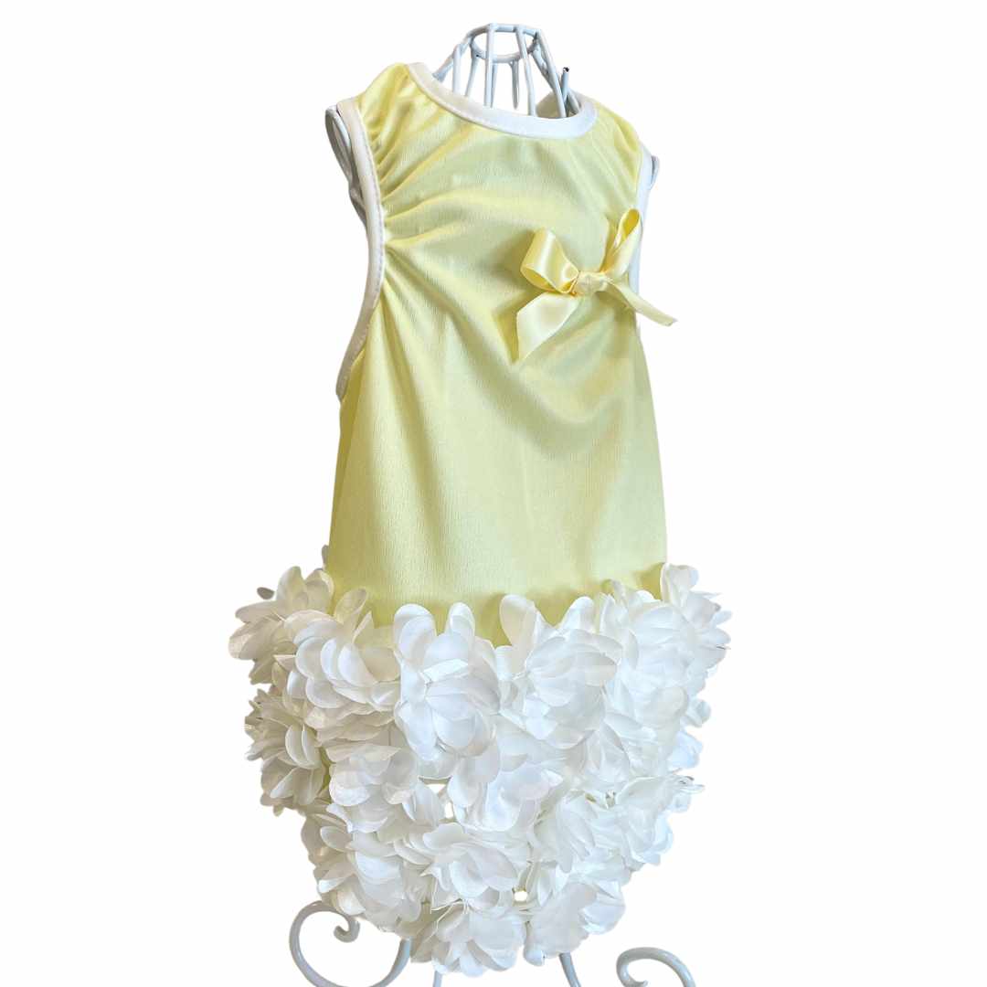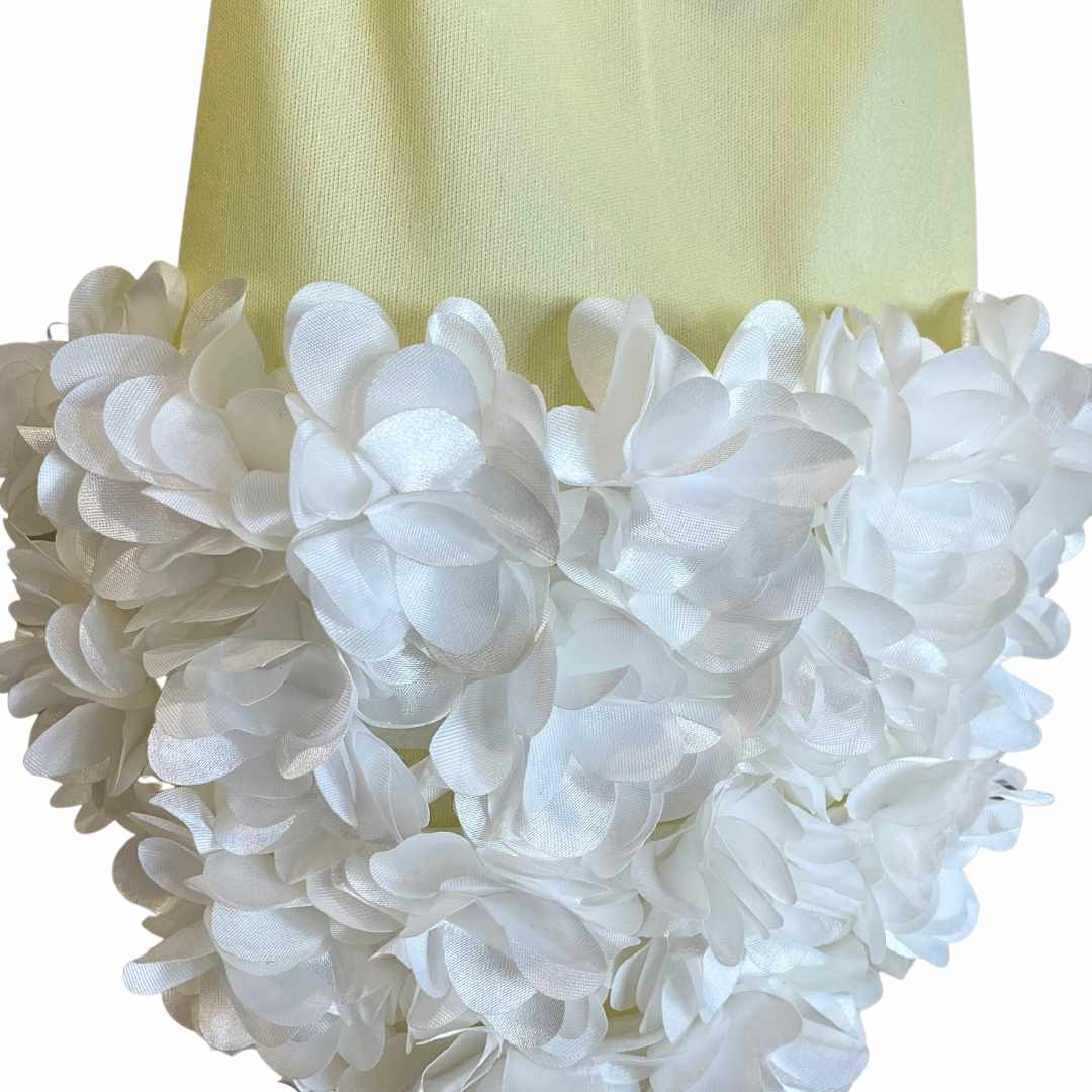 Pastel yellow jersey fabric dress with elegant white ruffles.
