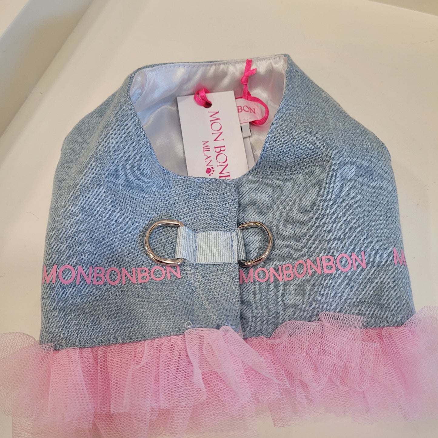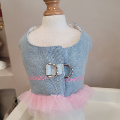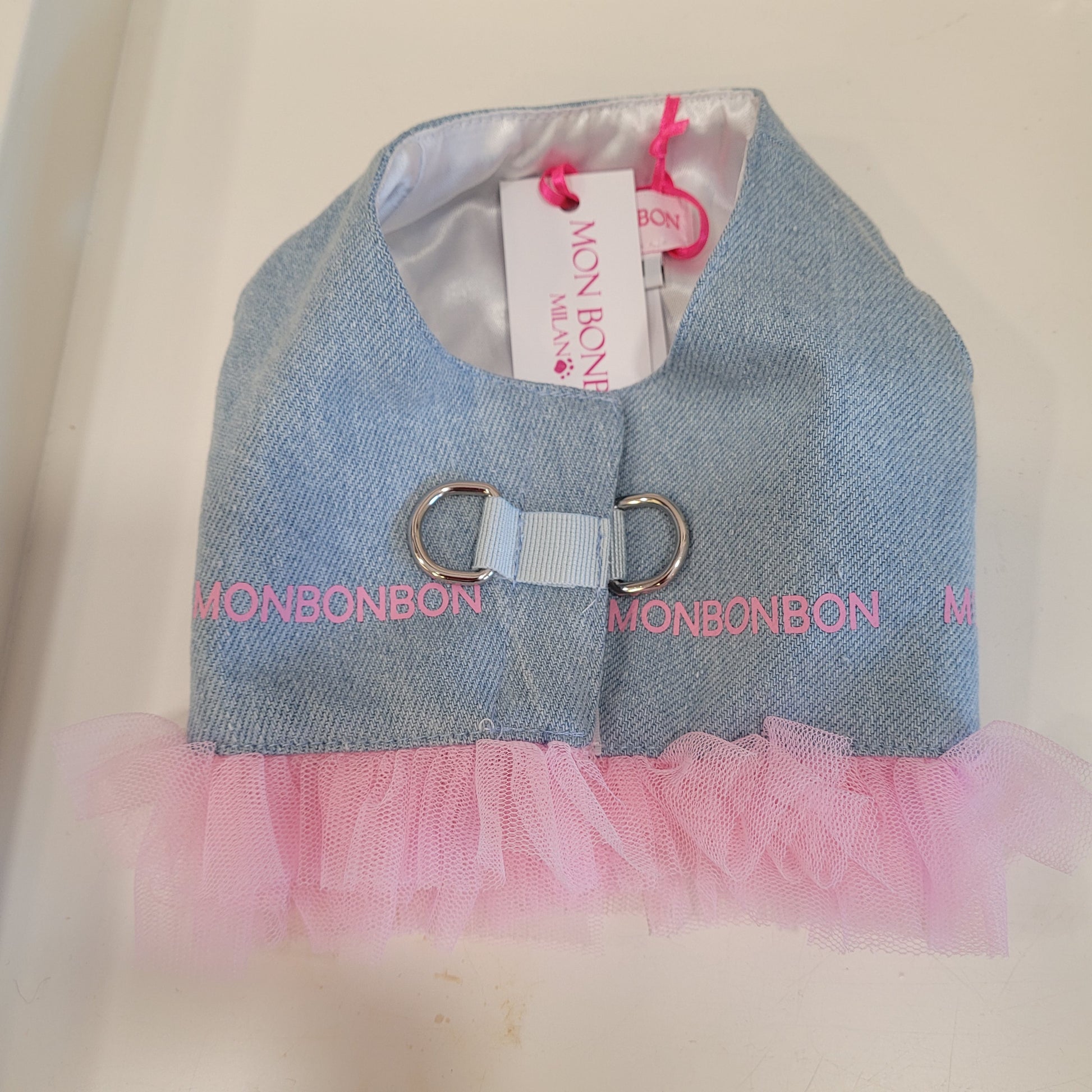 Pettorina in jeans chiaro morbidissimo con rifiniture tulle rosa e scritta mon bon bon.