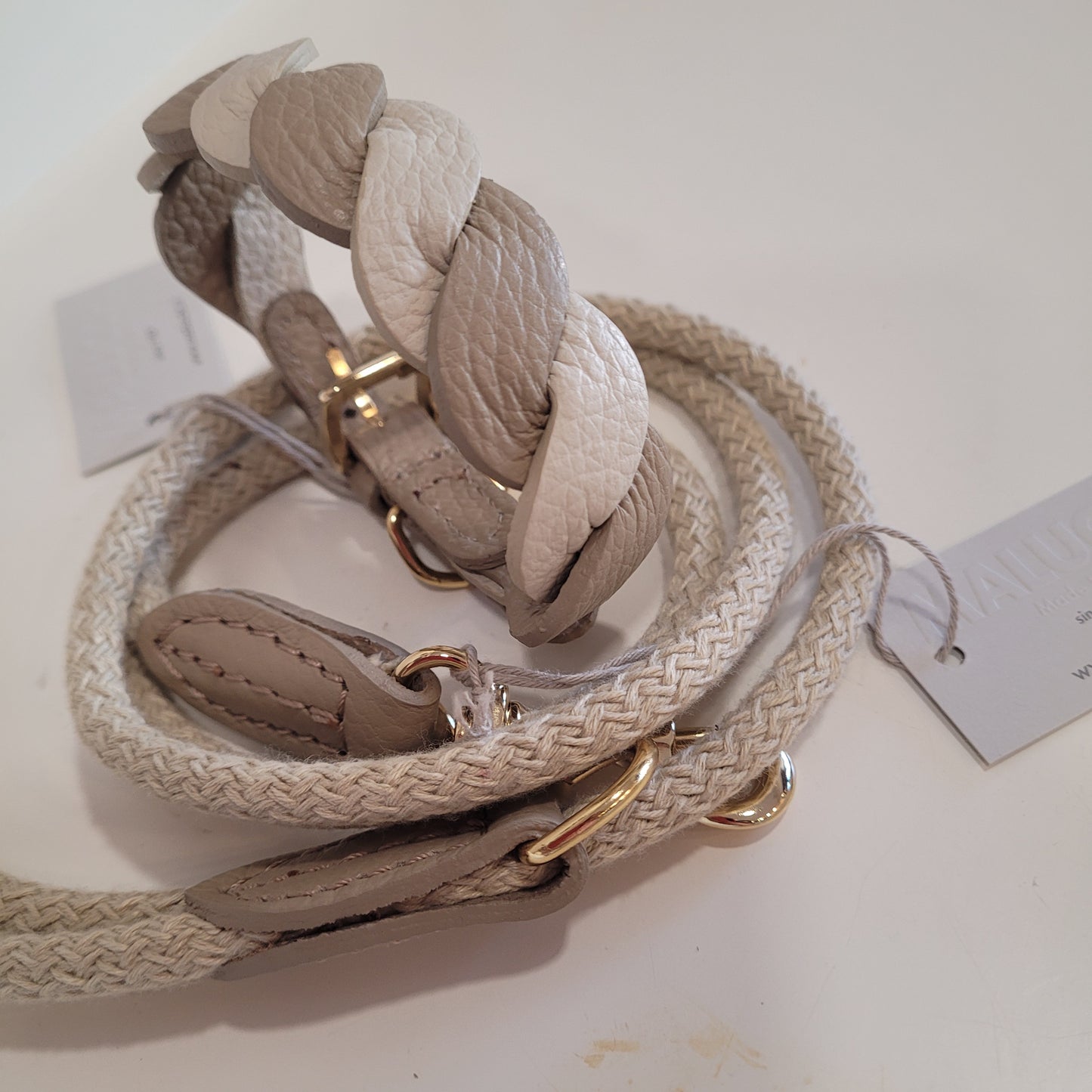 Collare intreccio in nappa morbidissima in 30 cm più guinzaglio cotone panna e Tortora cm 0.7x120