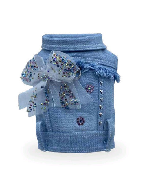 Pettorina in jeans trattato con borchiette e strass e fiocco spalla strass con spilla removibile