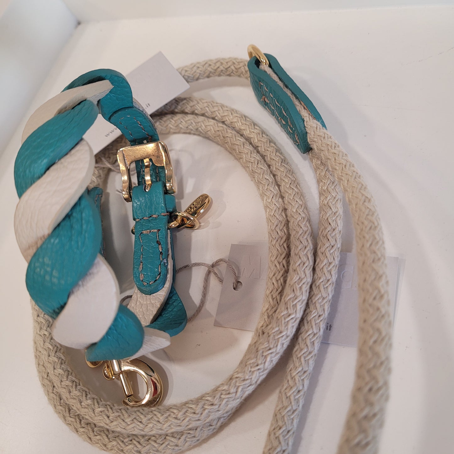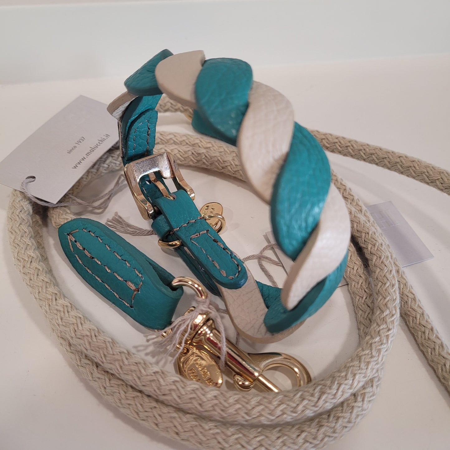 Collare intreccio in nappa morbidissima in 30 cm più guinzaglio in cotone Panna/Emerald