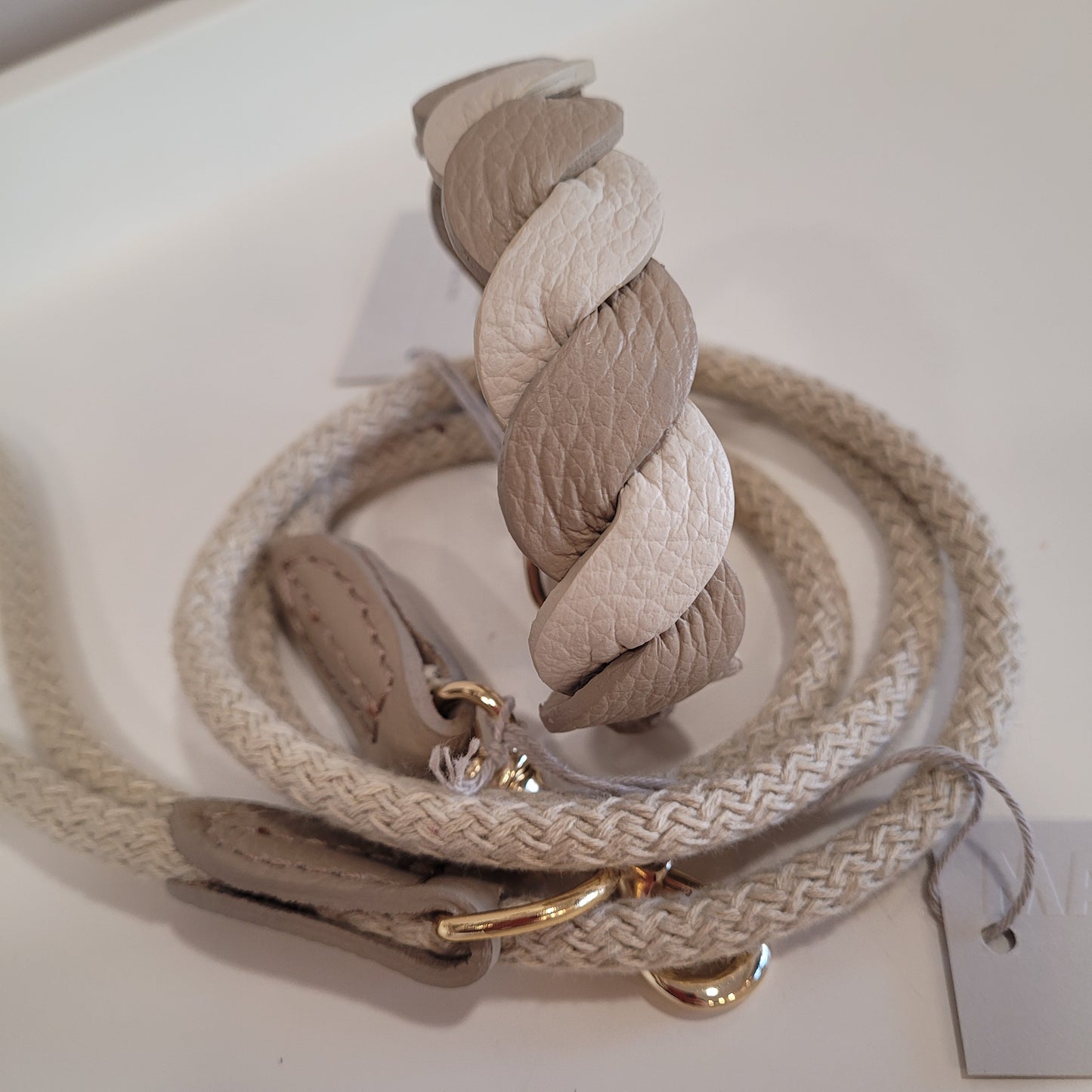 Collare intreccio in nappa morbidissima in 30 cm più guinzaglio cotone panna e Tortora cm 0.7x120