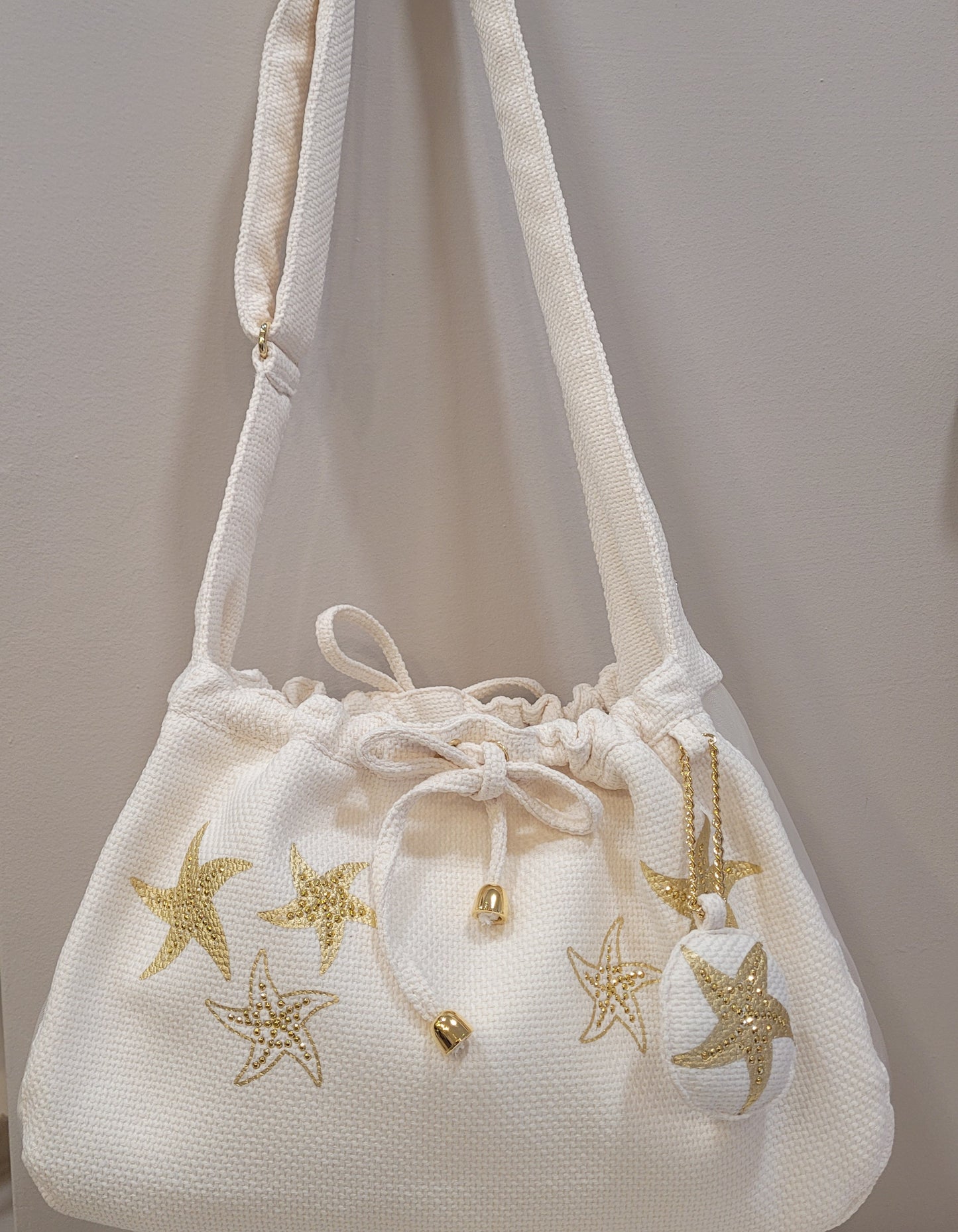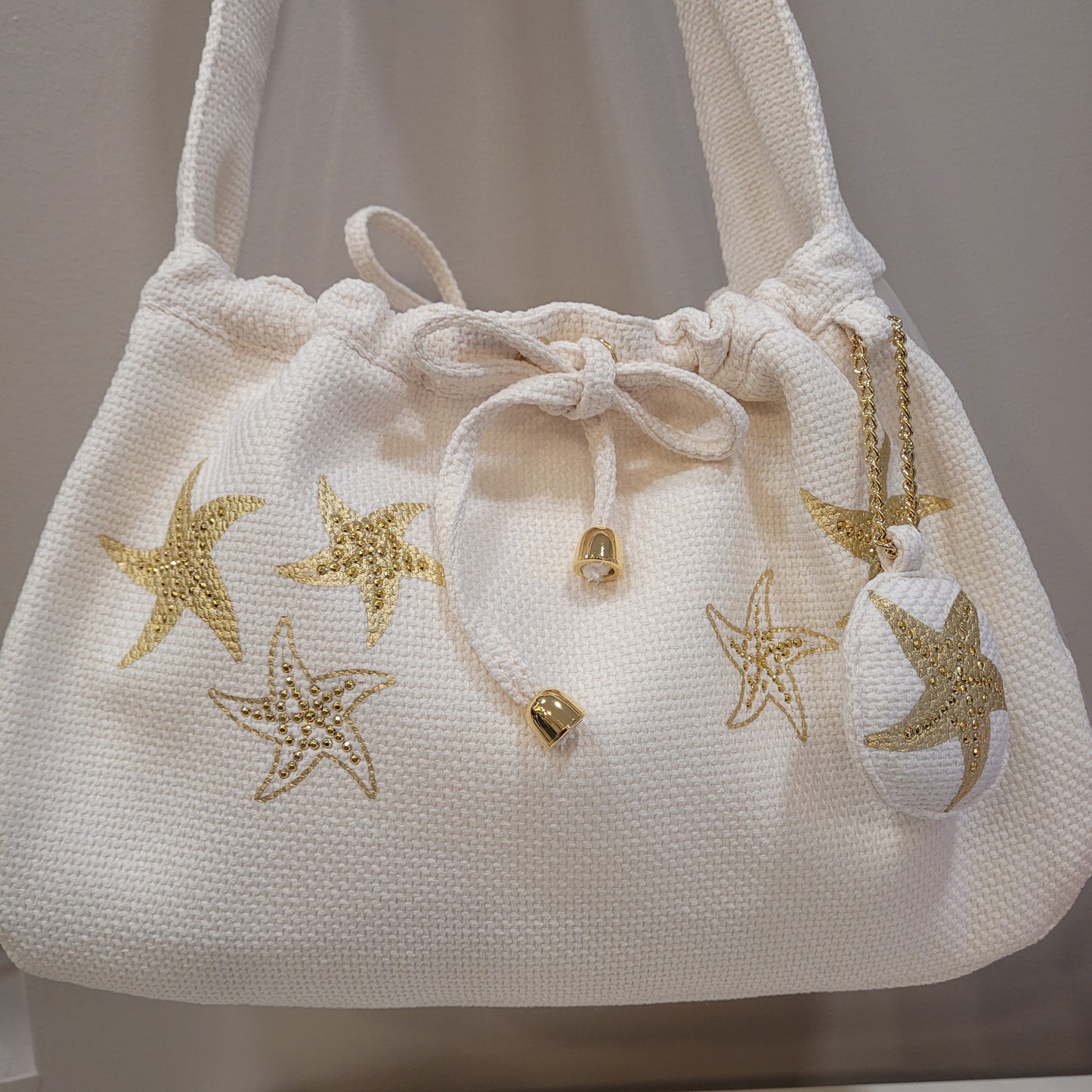 Monospalla in tessuto in cotone e lino molto raffinato in bianco con applicazioni ora stelle marine oro.